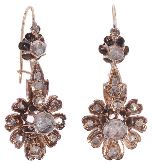 An attractive pair of Continental early 19th century rose diamond drop earrings