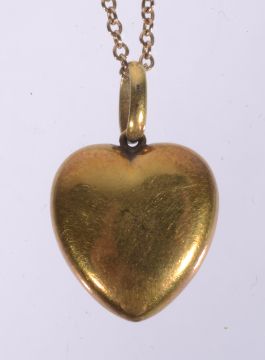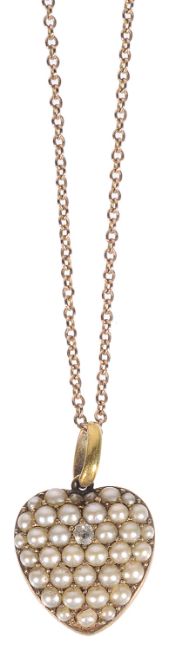 the yellow metal heart testing for gold and set overall to the front with half pearls and small central diamond, original hanging loop, suspended from a fine 9ct gold frame, associated fitted box