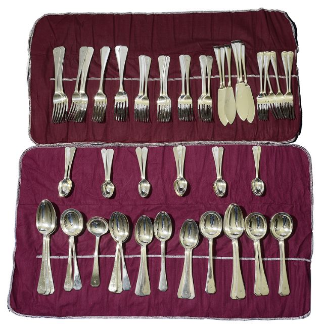 comprising eleven table forks, twelve dessert forks, twelve soup spoons, two ladles, twelve dessert spoons, six serving spoons, six fish knives and forks, three coffee spoons, fourteen teaspoons, each piece with initial 'S' on the terminal, (84).