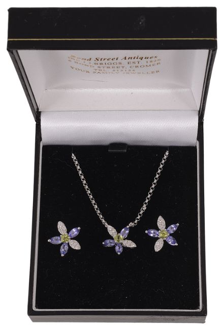 A contemporary tanzanite, diamond and peridot floral pendant on chain and matching earrings
