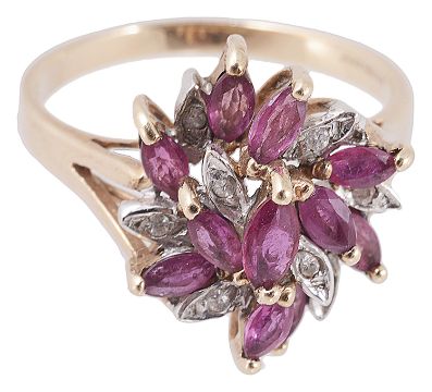 comprising two 9ct gold wedding bands and a 9ct gold mounted ruby cluster ring (4)