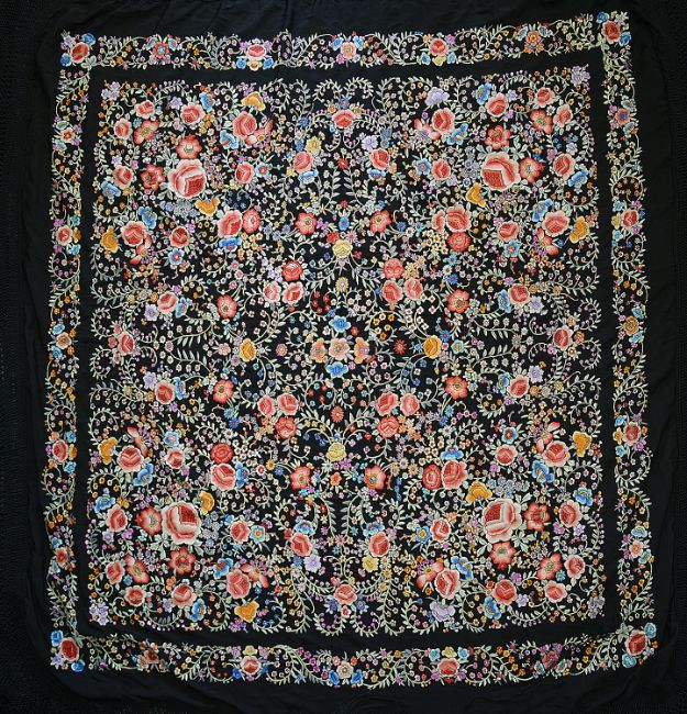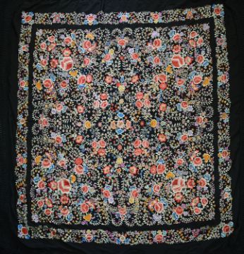 and profusely embroidered with coloured blooms and trailing foliage and having deep silk knotted fringe