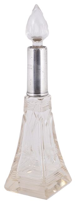 the tear drop faceted stopper, inset in a tapering square formed star cut decorated bottle, with a silver collar.