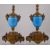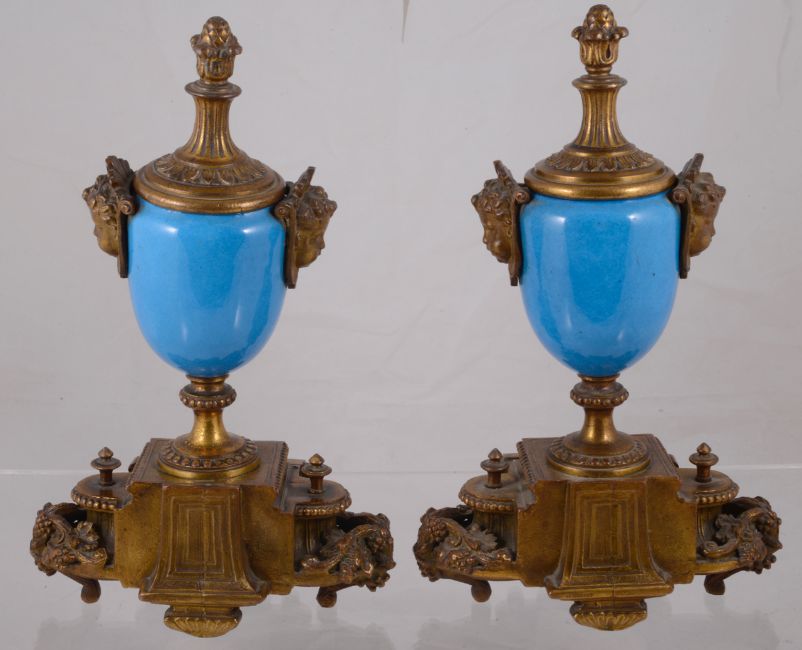 the porcelain oval body's in blue ground with a painted cartouches of a seated gentleman and lady, flanked by gilt metal masks, raised upon a beaded socle pedestal, upon a rectangular shaped base with swags of berries and porcelain panel, each with pineapple fluted finial lid, a/f, (2).
