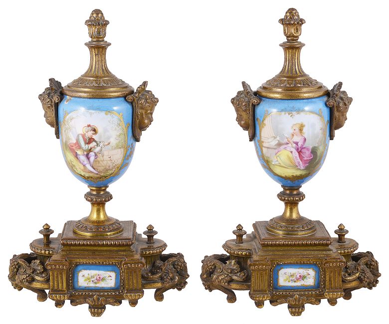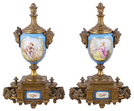 A pair of Sevres style porcelain and gilt metal urns