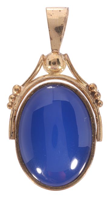 the oval centre swivelling to reveal a large oval cabochon banded agate to one side and a dyed blue chalcedony cabochon to the other, fully marked for 9ct gold