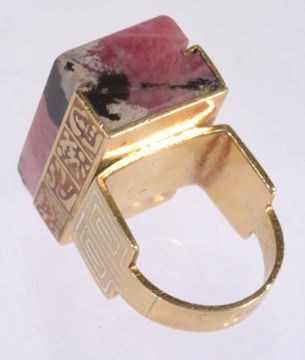 the rectangular pink rhodonite 'slotted' into a gold mount with enamel panels to either side, the shoulders with further white Greek key enamel to mount, yellow metal tests for high carat gold, marks to outer shank