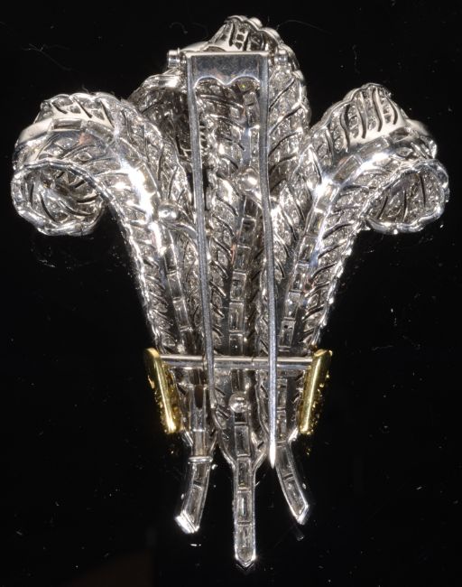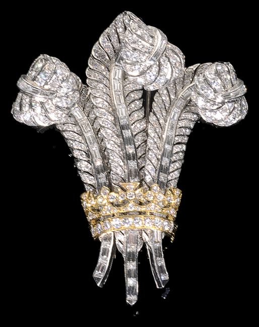 A diamond Prince of Wales Feathers brooch after the original which was gifted to Wallis Simpson by Edward VII and later purchased at auction by Elizabeth Taylor.
