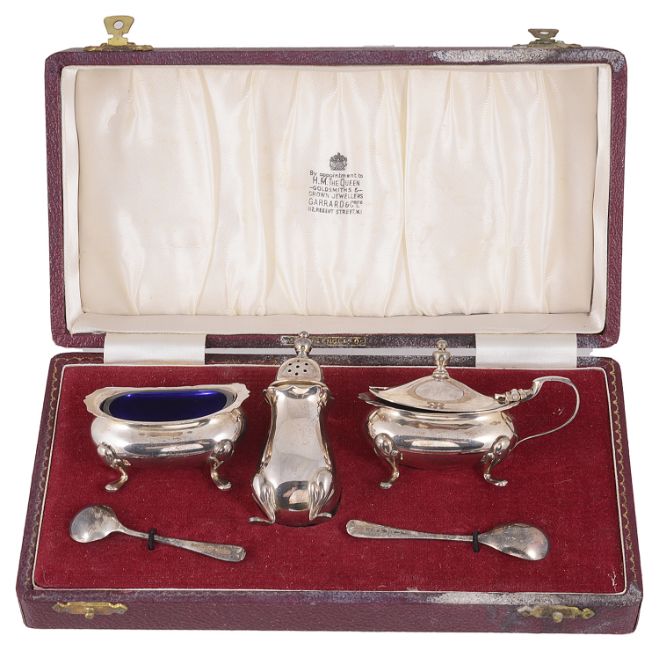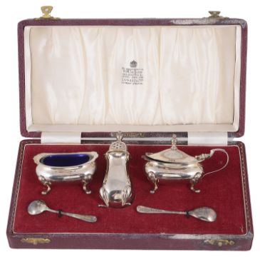 A contemporary Mappin & Webb silver twin handled quaich, hallmarked Birmingham 1970, of typical circular form, plain design with twin handles together with a cased Mappin & Webb silver cruet suite, hallmarked Birmingham 1971, comprising a salt, lidded mustard with blue liners, spoons and a pepperette in a fitted case, (4).weight: 13ozt approx; diameter of quaich: 15.2cm.Condition: Fair to good with wear to each item, tarnished, fitted case in good condition.ProvenanceSotheby's Sussex