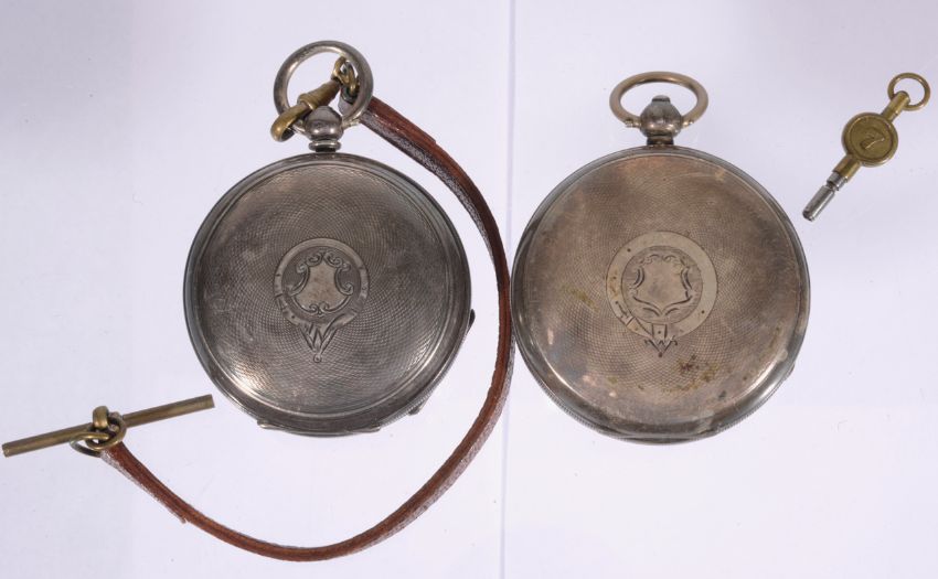 the white enamel dial with Roman hours, subsidiary seconds, spade hand, movement no: 681794, together with a Victorian E Harris & Co Liverpool open faced gentleman's pocket watch, hallmarked Birmingham 1896, with white enamel dial, roman hours, subsidiary seconds, spade hands, movement no. 62190Z, each with engine turned decorated case backs and keys, (2).