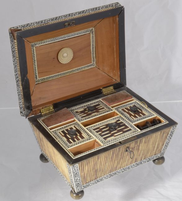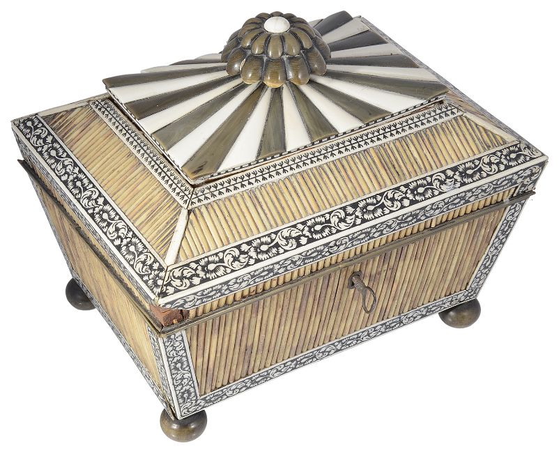 of sarcophagus form with hinged lid and horn rosette finial, horn and ivory rectangular top surrounded by porcupine quill and black etched ivory borders, the sides of similar decoration, the interior with drop in tray fitted with lidded compartments and a tier below, raised upon bun supports, with key, a/f.