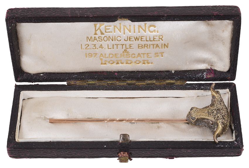 the head silver gilt and mounted on a yellow metal pin, test for gold, Kenning Masonic Jewellers associated box