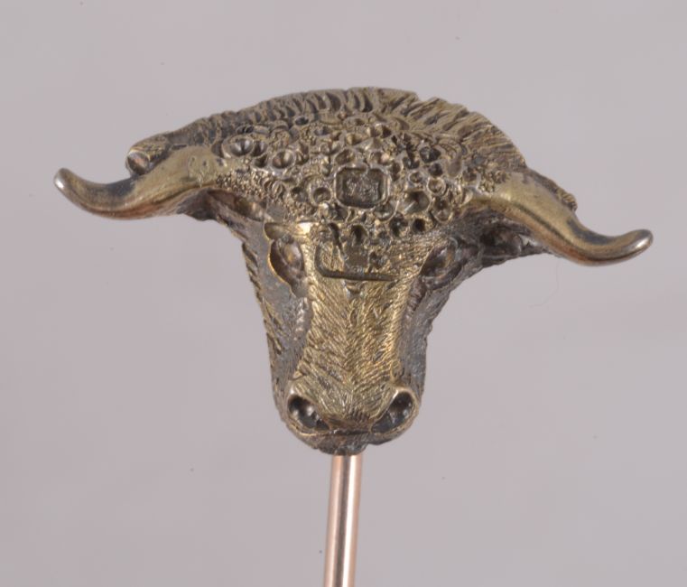 A yellow metal and silver gilt bull's head stickpin