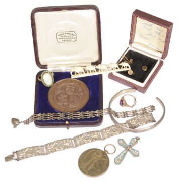 the opal ring formed as a large central oval opal set within a small green gem set cluster, sold together with a 9ct gold mounted amethyst dress ring, two silver bracelets and a silver engraved bangle, three 9ct gold studs, a John Pinches cased 'John Brown' bronze medallion, a WWI medal, mosaic pendant cross and a carved elephant brooch (qty)