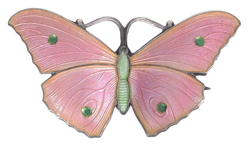 having iridescent pink guilloche enamelled wings with green 'jewelled' enamel detail, Birmingham 1916, maker J.A & S?