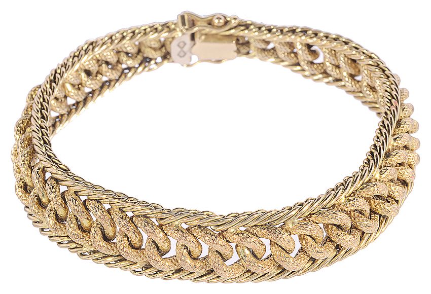 having central engraved curb link chain detail, invisible push clasp fastening, stamped .750 ITALY