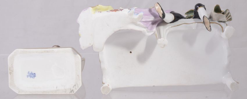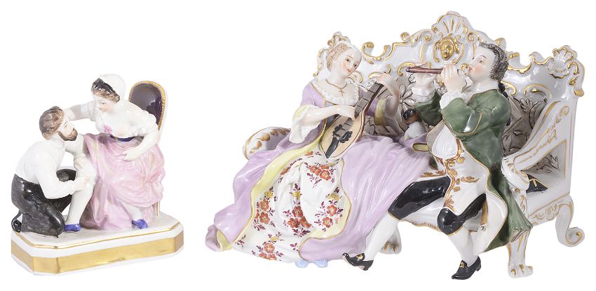 the first depicting a romantic couple seated upon a settee playing musical instruments, bears mark to base, the smaller group of a seated lady and gentleman kneeling upon a plinth base, bears blue factory mark to base, a/f, (2).