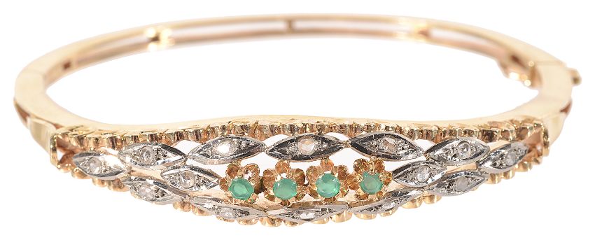 A Continental 18K gold emerald and diamond hinged bangle