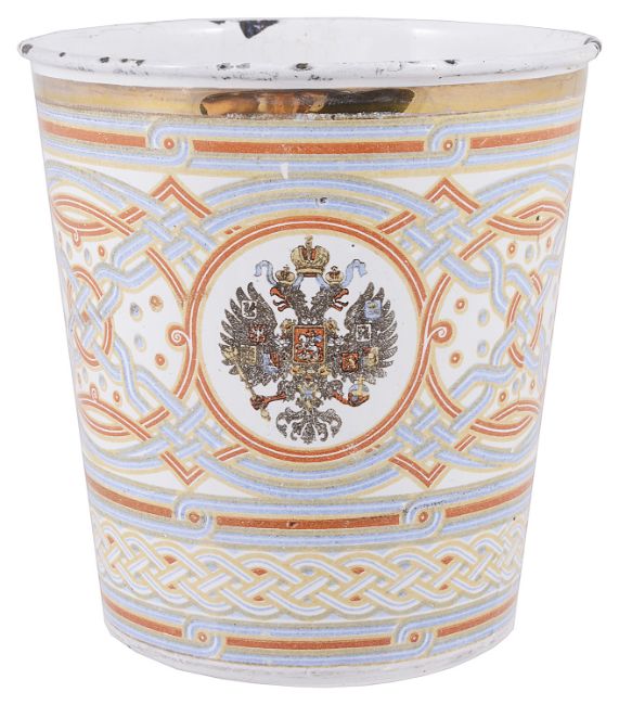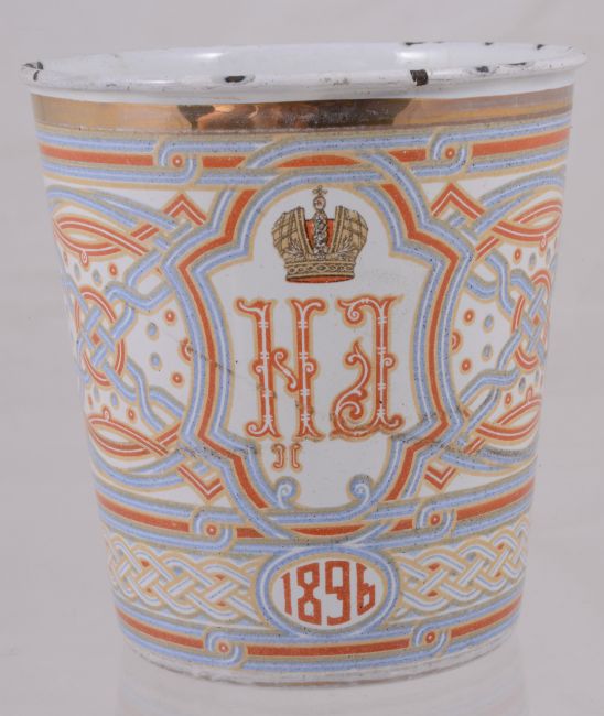 made for the Coronation of Tsar Nicholas II and Tsarina Alexander Feodorovna in 1896, the cup bearing cyphers of Nicholas and Alexander amongst a geometric pattern.