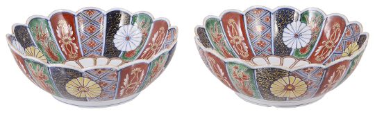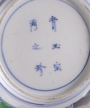 decorated in traditional style and enamelled with chrysanthemum blooms and with central chrysanthemum motif, six character underglaze blue mark to base, (2).