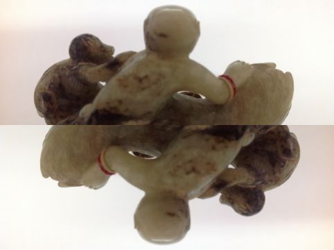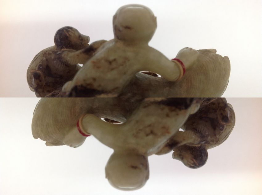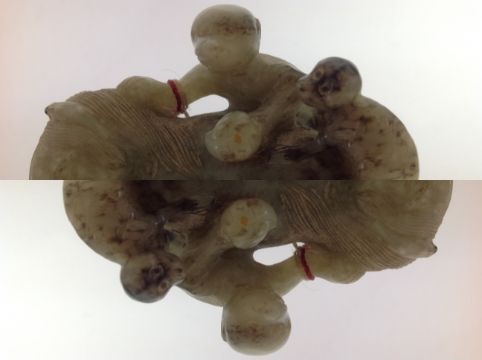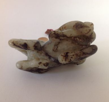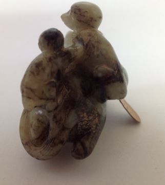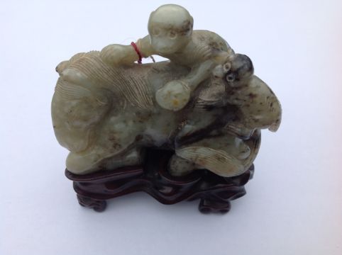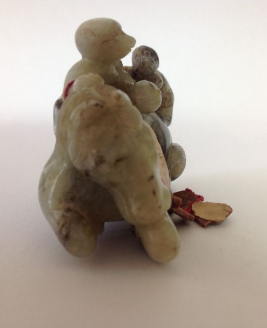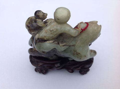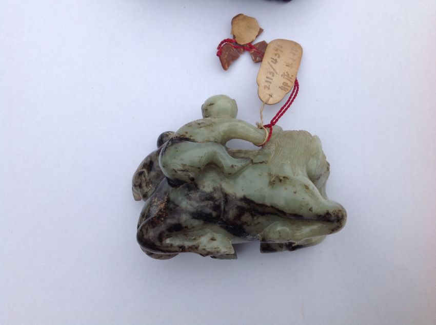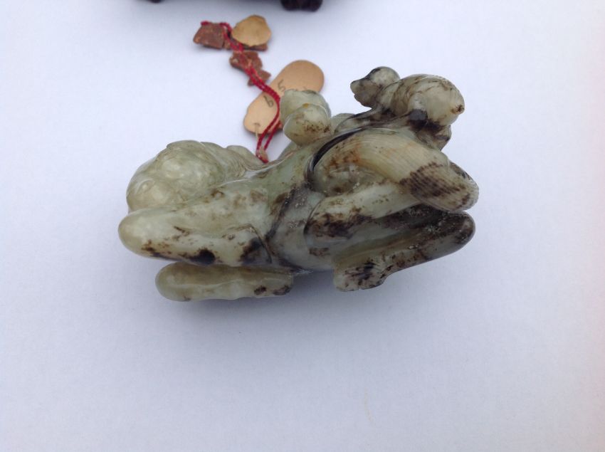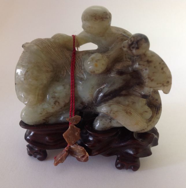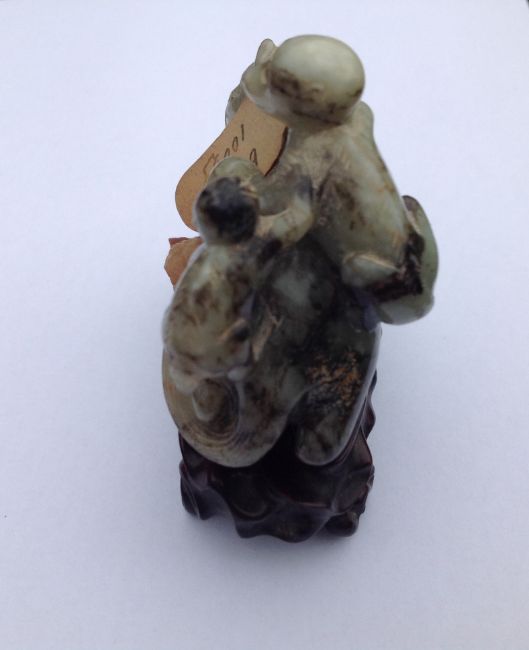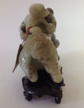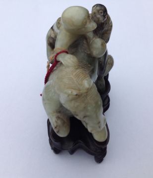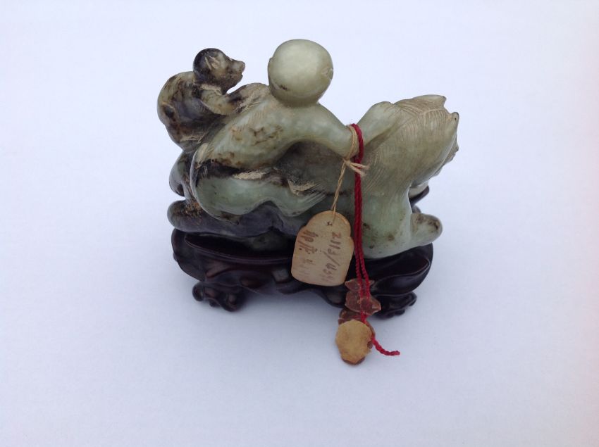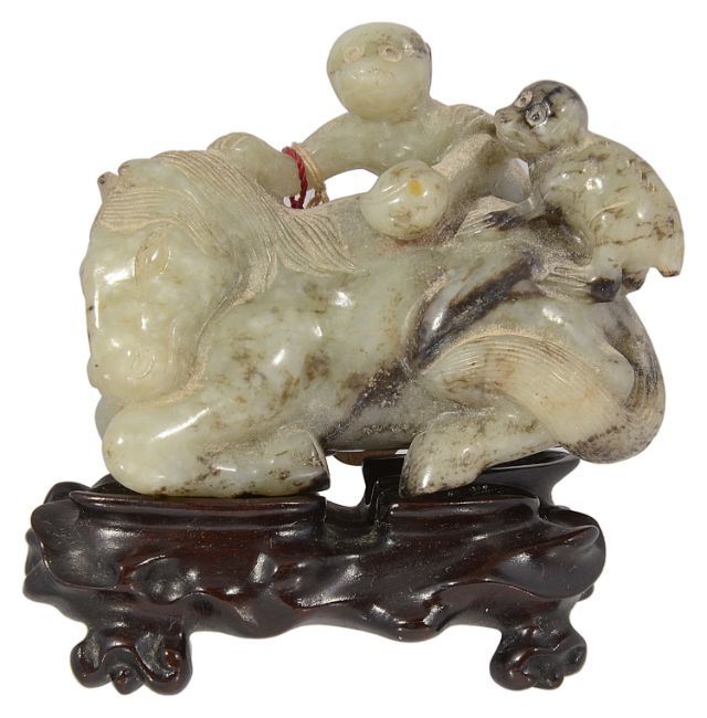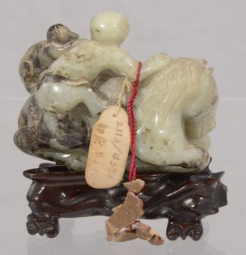 A late 19th century Chinese carved jade figure of a recumbent horse with two monkeys climbing upon his back, the black flecked celadon jade carving on hard wood fitted stand, wax seal label and swing label attached, (2).