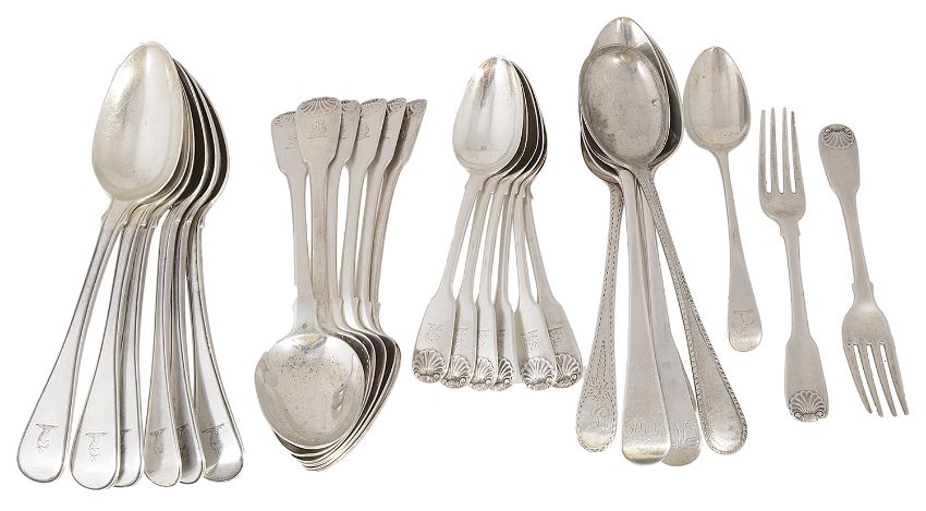 six serving spoons, six dessert spoons and two dessert forks, each in the shell pattern hallmarked 1818/1821 by William Eley & William Fearn; six thread pattern serving spoons hallmarked London 1818/1822 by William Eley & William Fearn; four further silver serving spoons, a dessert spoons and a silver-plated serving spoon, (24)