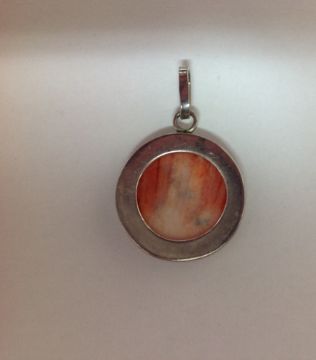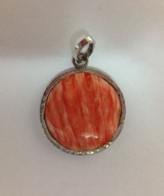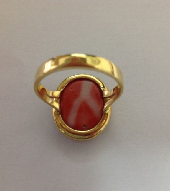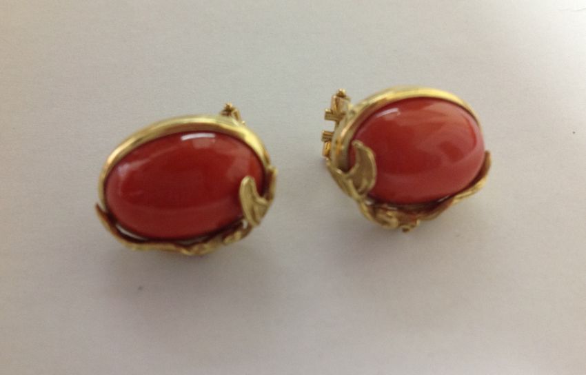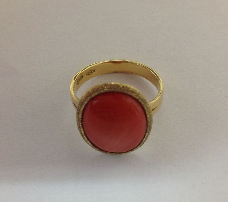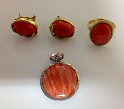 the oval coral ring in closed setting, together with a pair of coral earrings in a leaf shaped 18K gold mount (both marked 750), and a coral pendant in a silver mount (3)