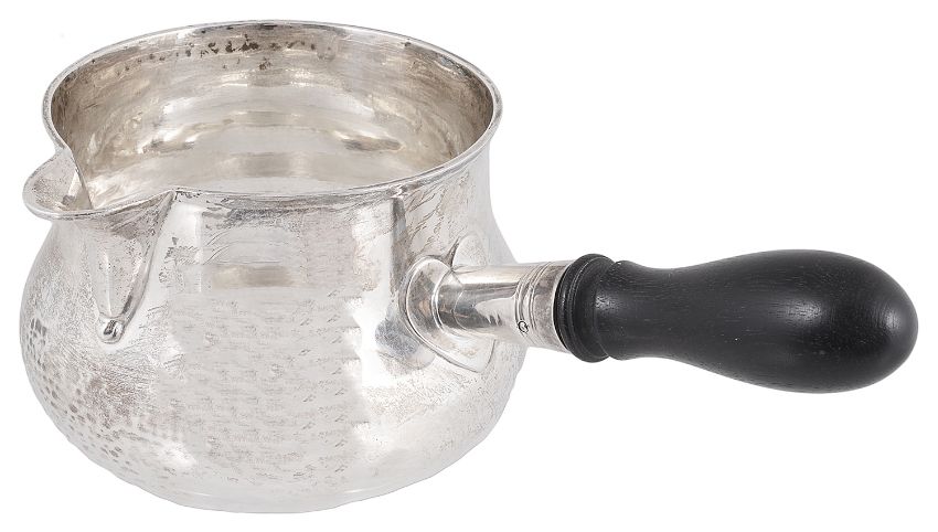 hallmarked London 1898, with makers initials GG for George Gillett, of hammered design with applied heart motif around the turned wooden handle