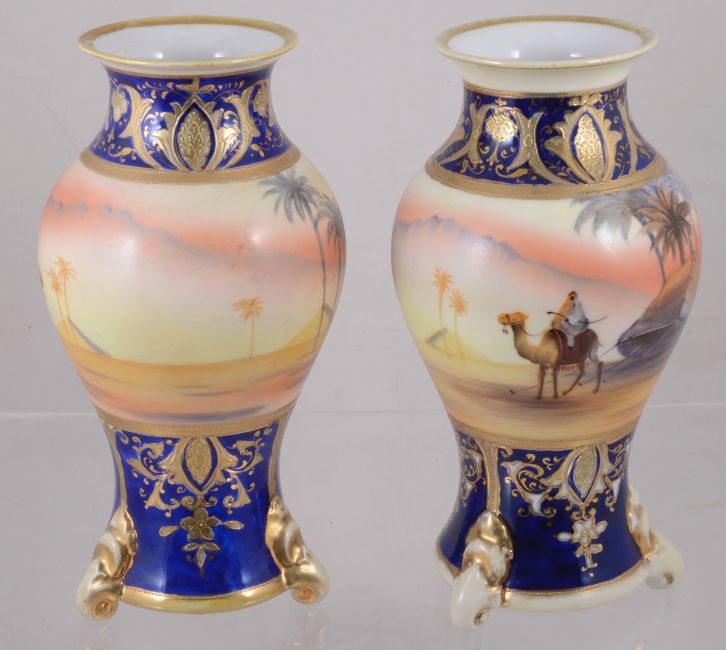 of baluster form decorated with North African landscape central band flanked by royal blue richly gilded borders, blue factory mark to base, (2).