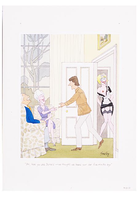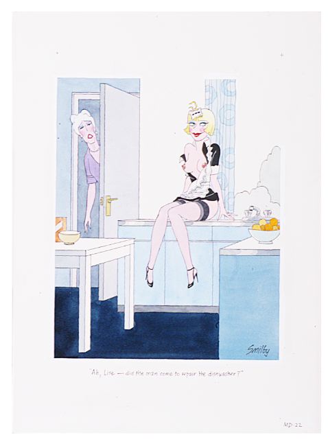 cartoon artwork, pen and ink with watercolour, on Daler board, signed lower left, captioned, artists note MD22 lower margin, with dust cover sheet, Smilby yellow dot verso, (3).