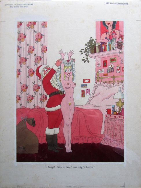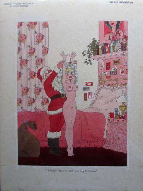 cartoon artwork for Playboy Dec 1989 pg. 165, drawn: Jul 1987, pen and ink with watercolour, on Daler board, signed lower left, artists notes in margins, caption below, Copyright Playboy All Rights Reserved stamp & Playboy Publications Inc Reproduction Prohibited Without Permission upper margins & verso, Smilby yellow dot verso, in cellophane cover, together with artists rough workup for this artwork with artists notes in margins, signed lower right, (2).