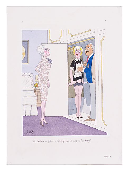 cartoon artwork, pen and ink with watercolour, on Daler board, signed lower left, captioned, artists note MD29 lower margin, with dust cover sheet, Smilby yellow dot verso;