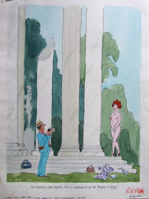 cartoon artwork for Diners Club Austria Jun 1986 pg.45, drawn: Mar 1986, pen and ink with watercolour, on Daler board, signed lower right, caption below, Smilby yellow dot verso, with dust sheet, together with two artists rough workup for this artwork with artists notes in margins, signed lower right on one, (3).