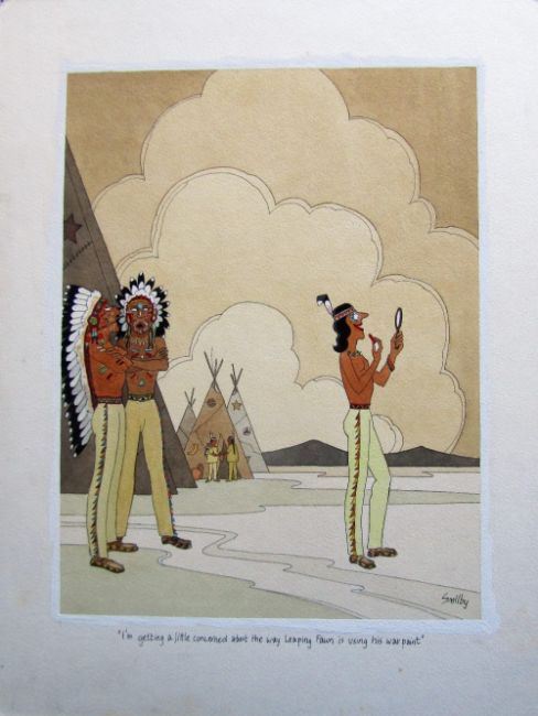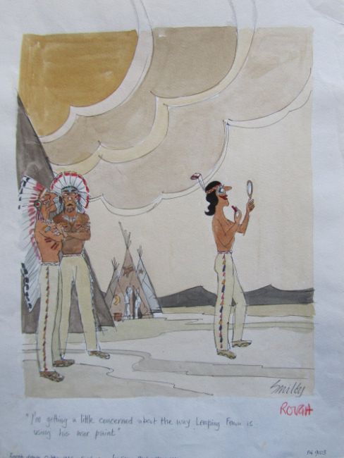 cartoon artwork for Playboy Germany Aug 1991 pg.135, drawn: Mar 1991, pen and ink with watercolour, on Daler board, signed lower right, caption below, Smilby yellow dot verso, with dust sheet, together with artists rough workup for this artwork with artists notes in margins, signed lower right, (2).