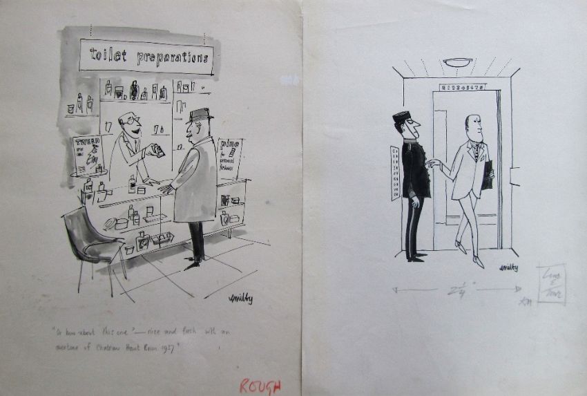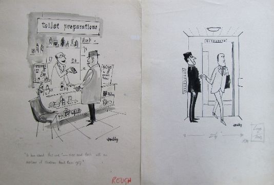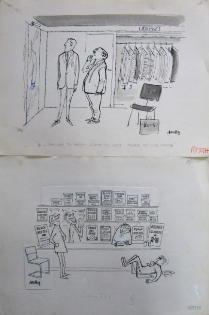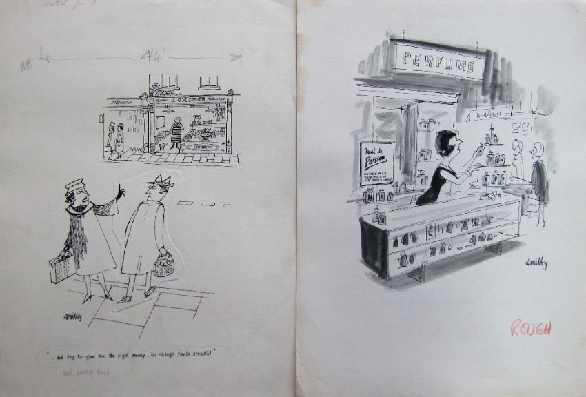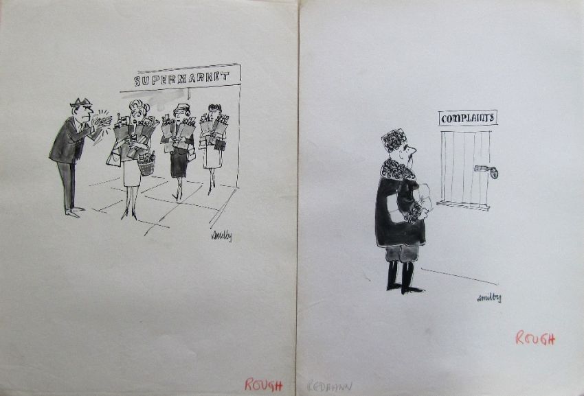 a collection ink and pen 'Retail Therapy' themed original artists rough drawings and sketches for various magazines, including Punch, Playboy, each on artists paper, some signed Smilby with captions, artists notes in margins, (qty).