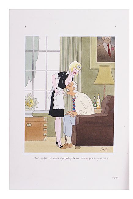 cartoon artwork, pen and ink with watercolour, on Daler board, signed lower right, captioned, artists note MD46 lower margin, with dust cover sheet, Smilby yellow dot verso, (3).