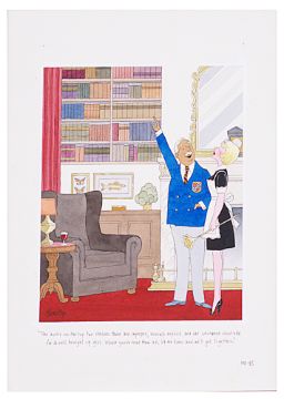 cartoon artwork, pen and ink with watercolour, on Daler board, signed lower left, captioned, artists notes and MD45 lower margin, with dust cover sheet, Smilby yellow dot verso;