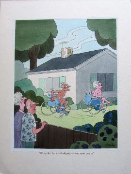 cartoon artwork for Diners Club Austria Oct 1989 pg.131, drawn: Jul 1988, pen and ink with watercolour, on Daler board, signed lower right, caption below, Smilby yellow dot verso, with dust sheet.