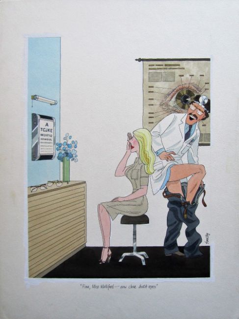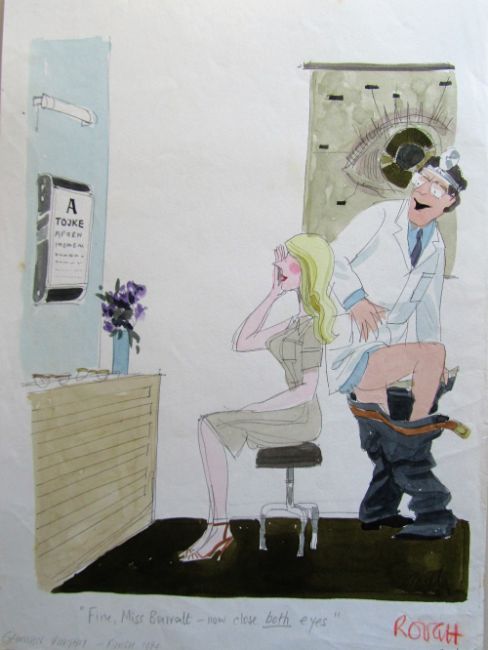 cartoon artwork for Playboy Germany Oct 1984 pg.131, drawn: Apr 1984, pen and ink with watercolour, on Daler board, signed right, caption below, Smilby yellow dot verso, with dust sheet, together with artists rough workup for this artwork with artists notes in margins, signed lower right, (2).