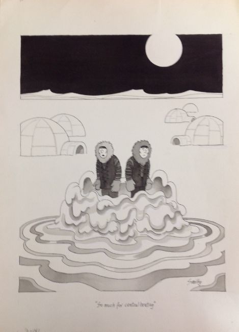 cartoon artwork for Diners Club Austria Oct 1984, pen and ink, on artists paper, signed lower right, caption below, artists notes in margin, total paper: 280 x 387mm;