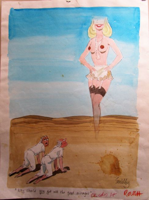 cartoon artwork for Playboy Germany, pen and ink with watercolour, on Daler board, signed right, caption below, Smilby yellow dot verso, together with artists rough workup for this artwork with artists notes in margins, signed lower right, (2).