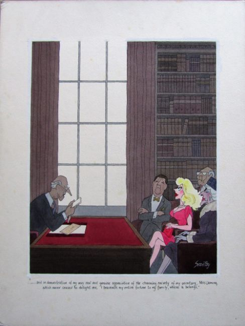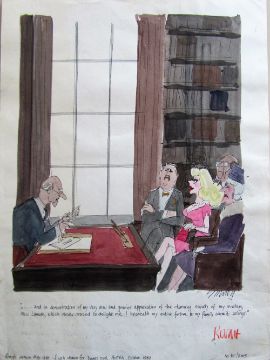 unpublished cartoon artwork for Diners Club Austria, drawn: Oct 1989, pen and ink with watercolour, on Daler board, signed lower right, caption below, Smilby yellow dot verso, with dust sheet, together with artists rough workup for this artwork with artists notes in margins, signed lower right, (2).
