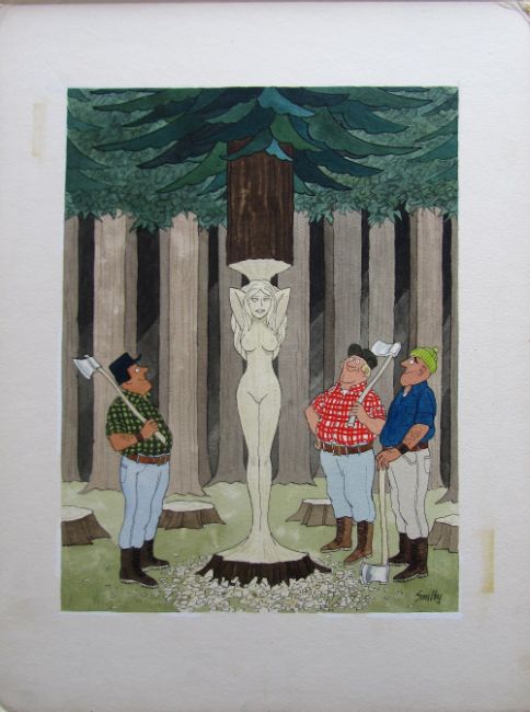 uncaptioned cartoon artwork for Pardon Magazin Germany, drawn: 1970's pen and ink with watercolour, on Arne board, signed right, caption below, Smilby yellow dot verso, with dust sheet.