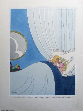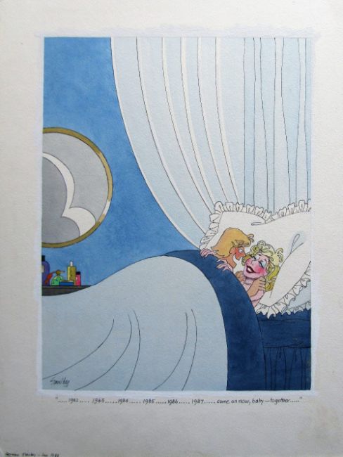 cartoon artwork for Playboy Germany Jan 1989 pg.89, drawn: Jun 1988, pen and ink with watercolour, on Daler board, signed lower left, caption below, artists notes in margin, Smilby yellow dot verso, with dust sheet, together with artists rough workup for this artwork with artists notes in margins, signed lower right, (2).