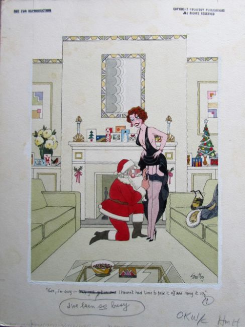 cartoon artwork for Playboy Jan 1995 pg.129, drawn: July 1990, pen and ink with watercolour, on Daler board, signed lower right, artists notes lower margin with part of the caption crossed out, Copyright Playboy All Rights Reserved stamp & Playboy Publications Inc Reproduction Prohibited Without Permission upper margin & verso, Smilby yellow dot verso, with dust sheet.