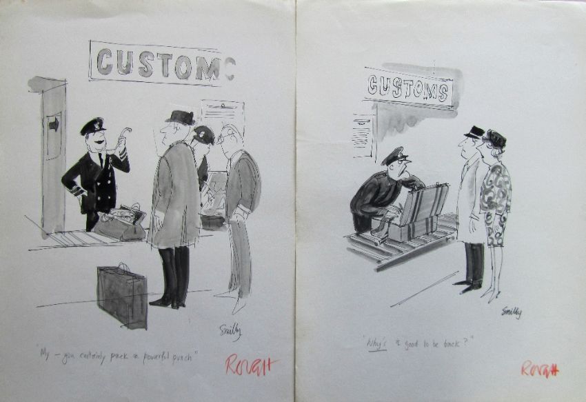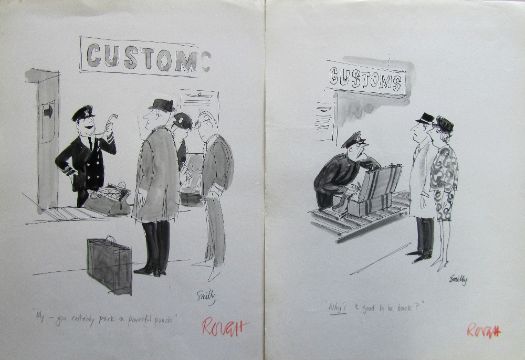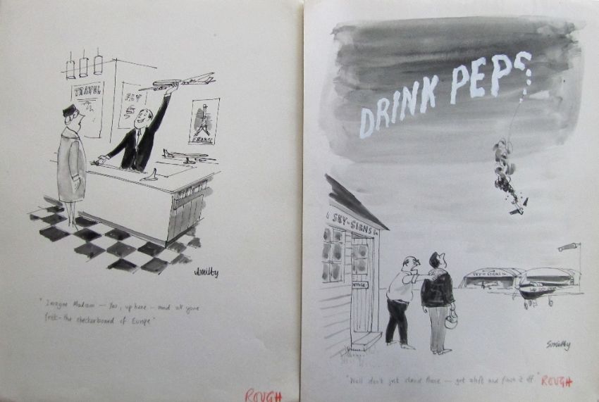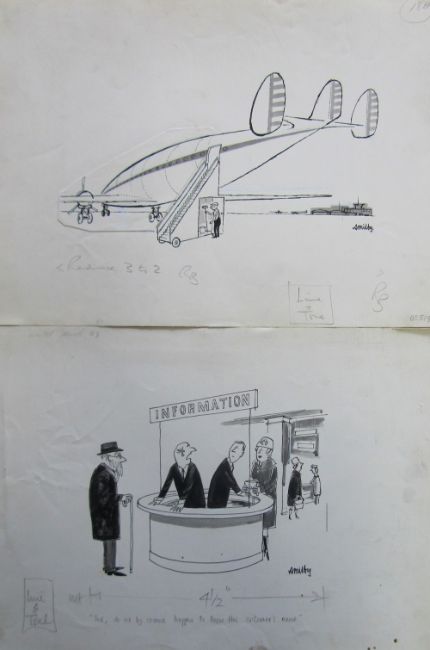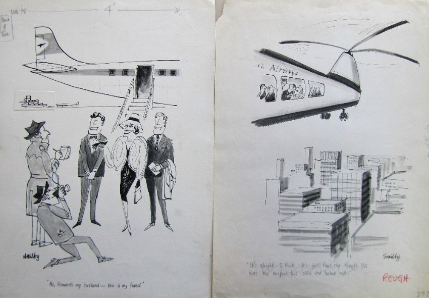 a collection ink and pen 'Air Travel' themed original artists rough drawings and sketches for various magazines, including Punch, Playboy, each on artists paper, some signed Smilby with captions, artists notes in margins, (qty).