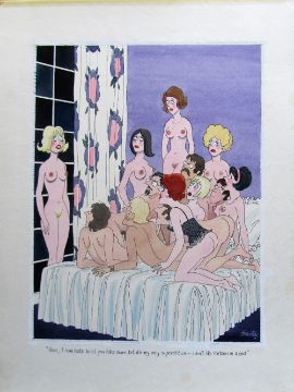 cartoon artwork for Playboy Germany Oct 1985 pg.89, drawn: May 1985, pen and ink with watercolour, on artists paper on Daler board, signed lower right, caption below, Smilby yellow dot verso, with dust sheet.