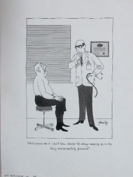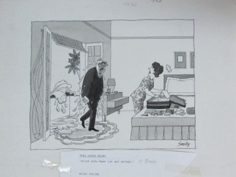 cartoon artwork for Nebelspalter Switzerland Dec 1985, pen and ink, on artists paper, signed lower right, artists notes in margin, caption below, together with artists rough workup for this artwork with artists notes in margin, drawn: Jul 1968, signed lower right, total paper: 277 x 372mm, paper rough: 278 x 369mm;
