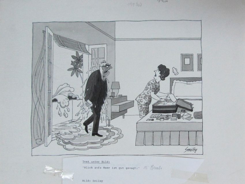 cartoon artwork for Nebelspalter Switzerland Jan 1986, pen and ink, on artists paper, signed lower right, artists notes in margin, caption below, together with artists rough workup for this artwork with artists notes in margin, drawn: 1971, signed lower right, total paper: 370 x 278mm, paper rough: 378 x 275mm;