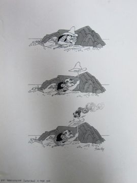 cartoon artwork for Nebelspalter Switzerland Apr 1989, pen and ink, on artists paper, signed lower right, artists notes in margin, uncaptioned, together with two artists rough workup for this artwork with artists notes in margin, drawn: Sep 1968, signed lower right, total paper: 365 x 278mm, paper rough: 383 x 277mm;
